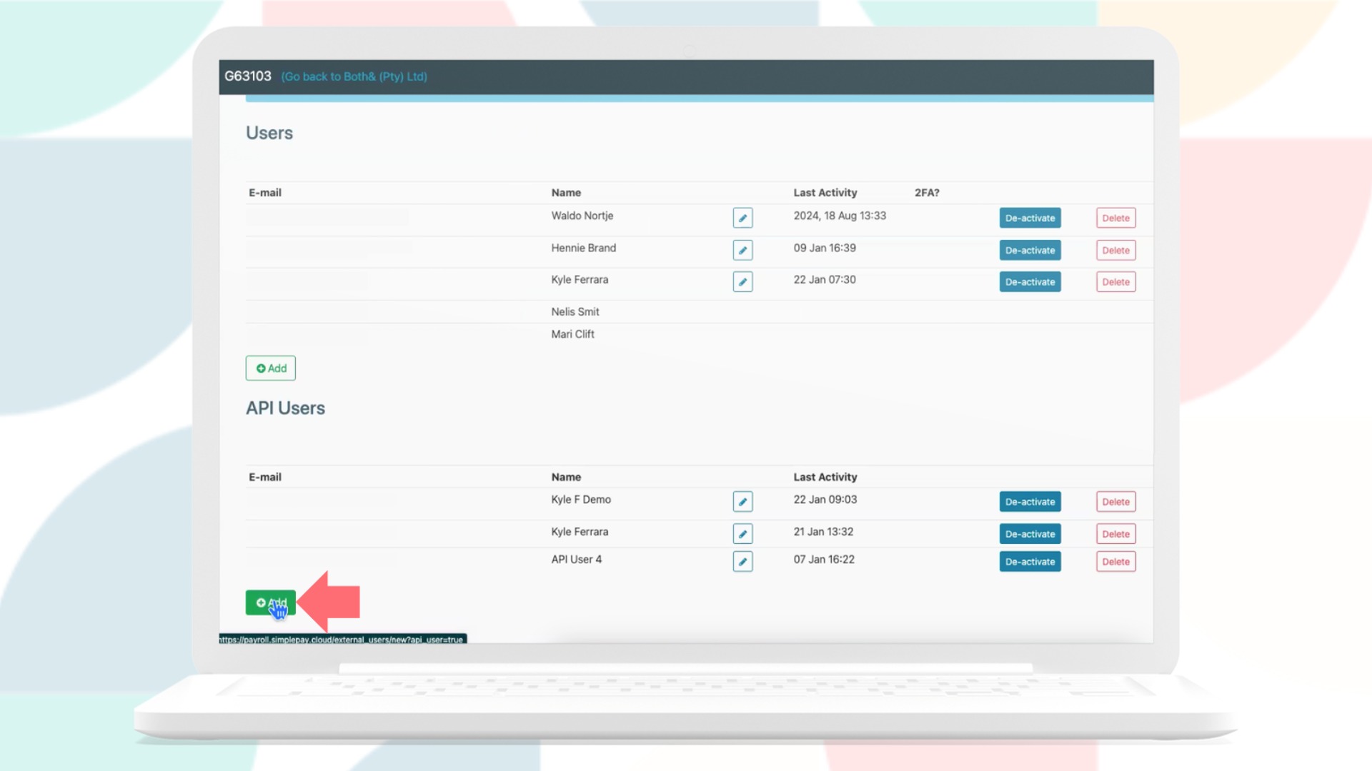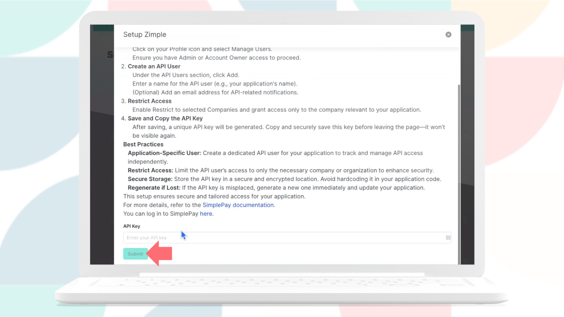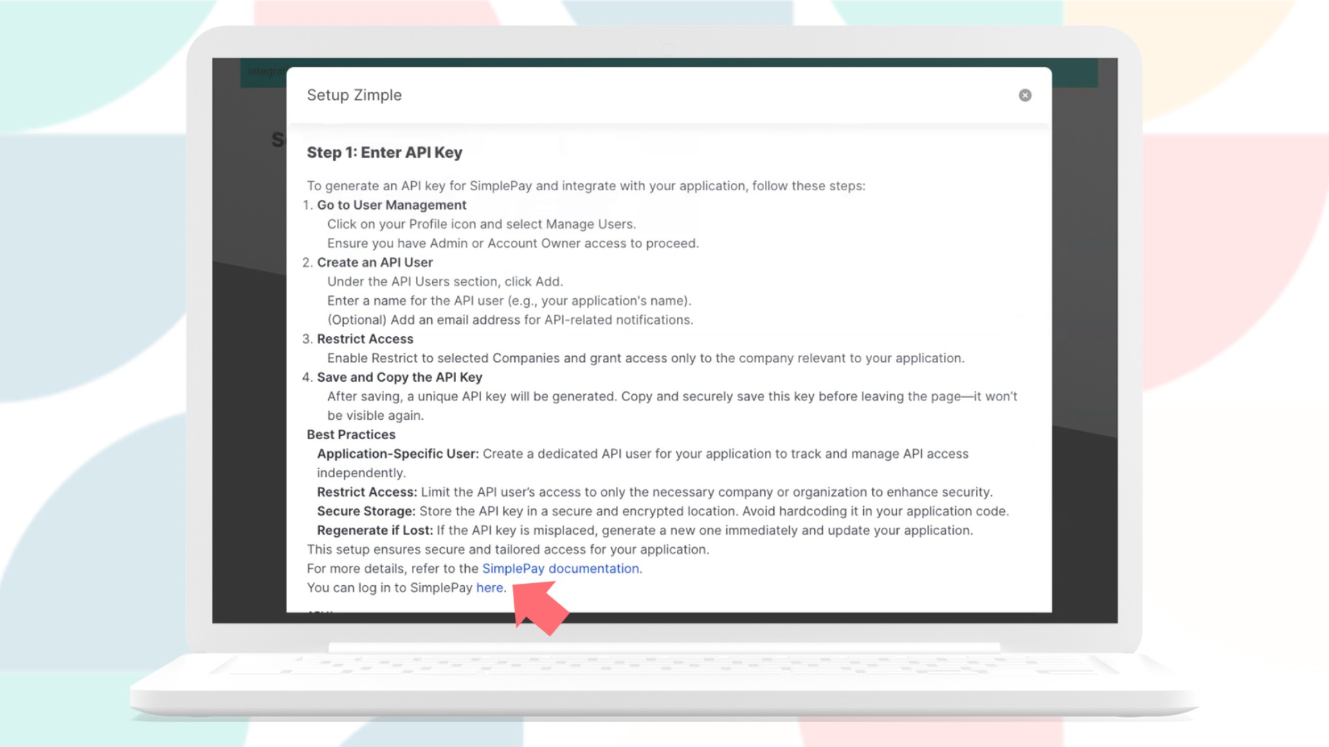 Read through the wizard's set-up instructions carefully. You will need to create an API user in Simple Pay to integrate Simple Pay with Zoho People. This is done in Simple Pay under the User Management Settings, as indicated in the steps below.