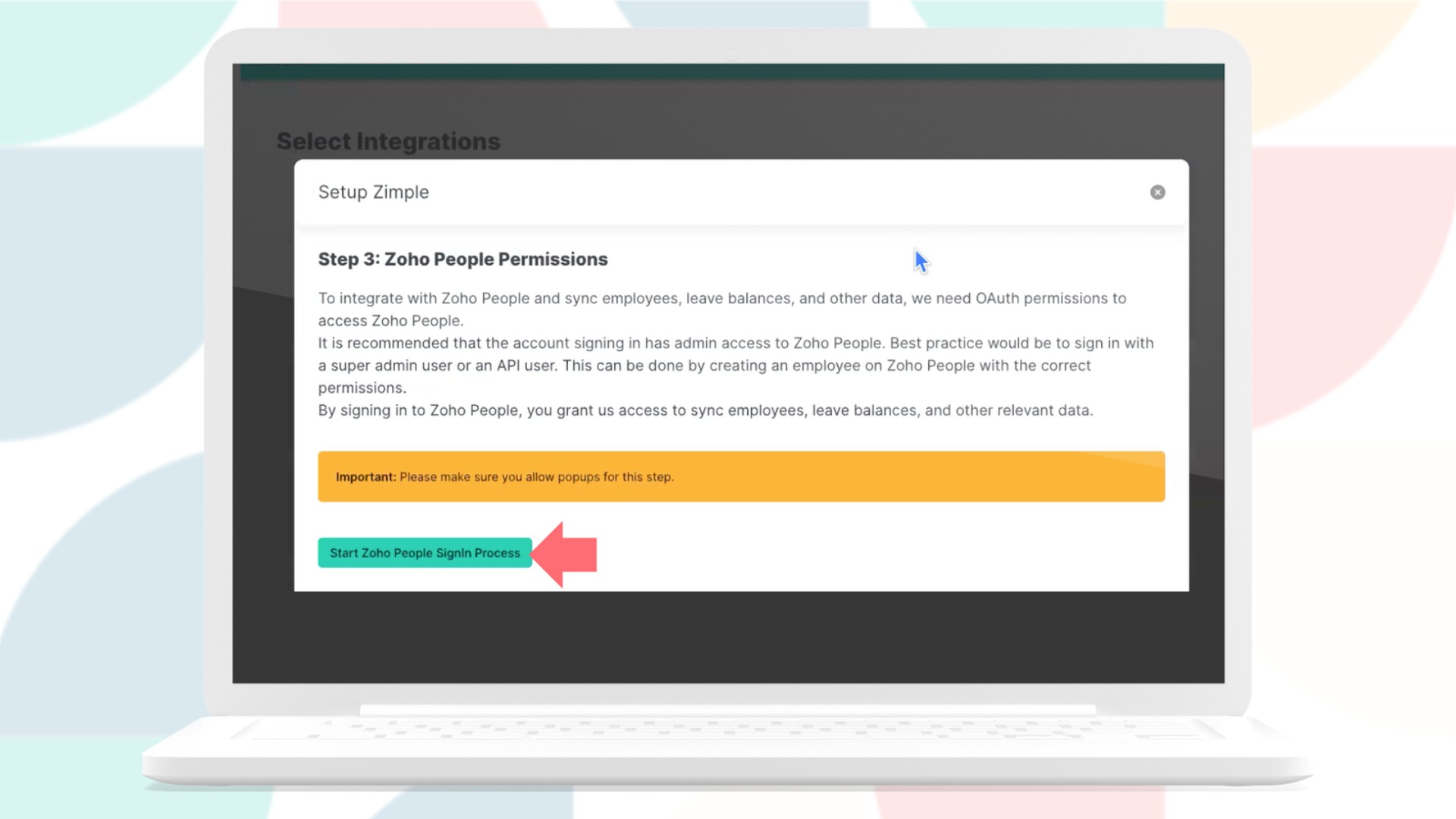 Make sure pop-ups are enabled! You will be prompted to sign into Zoho People to authorise the access.