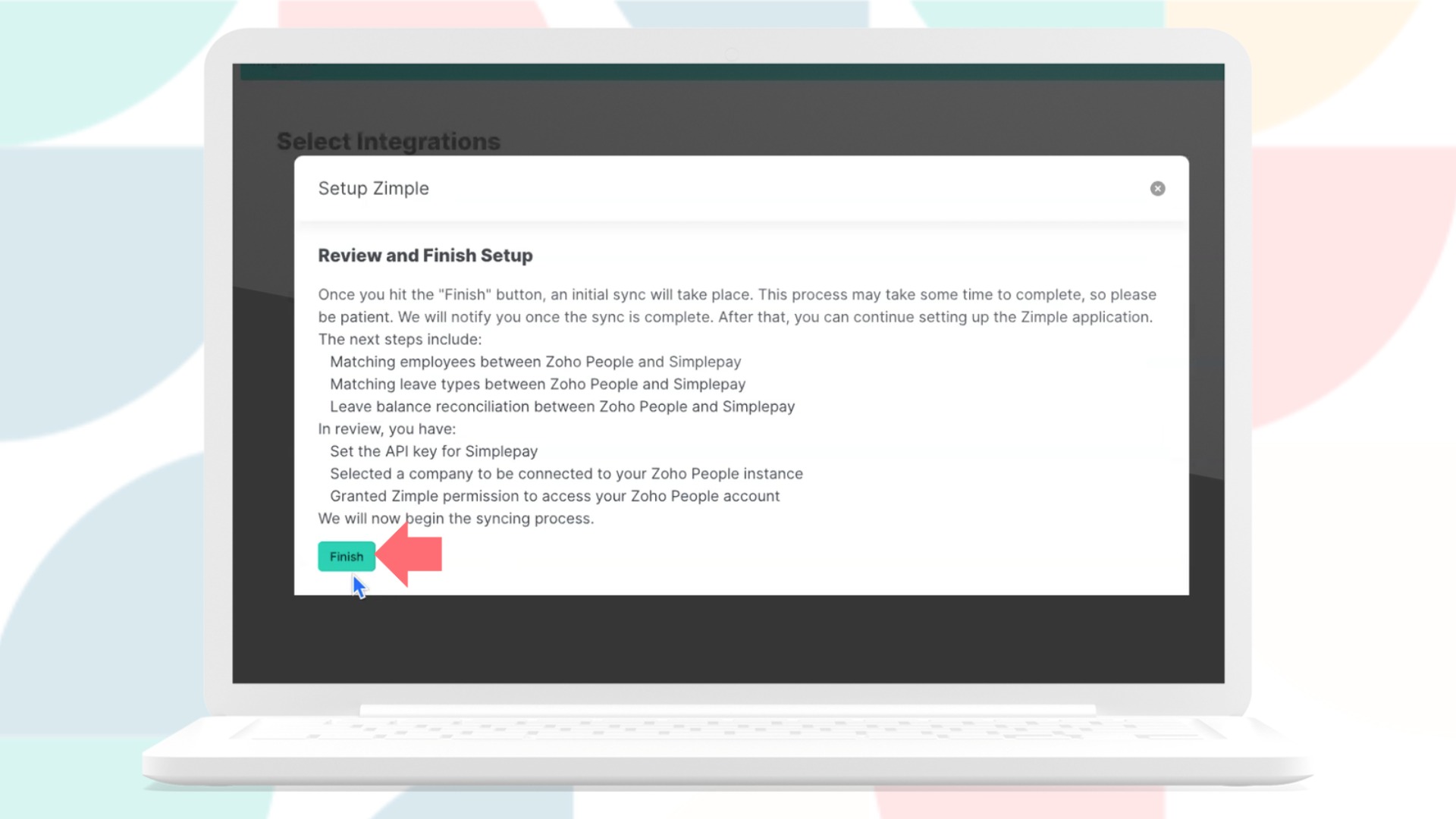 Review the set-up instructions for Simple Pay and Zoho People before clicking Finish.