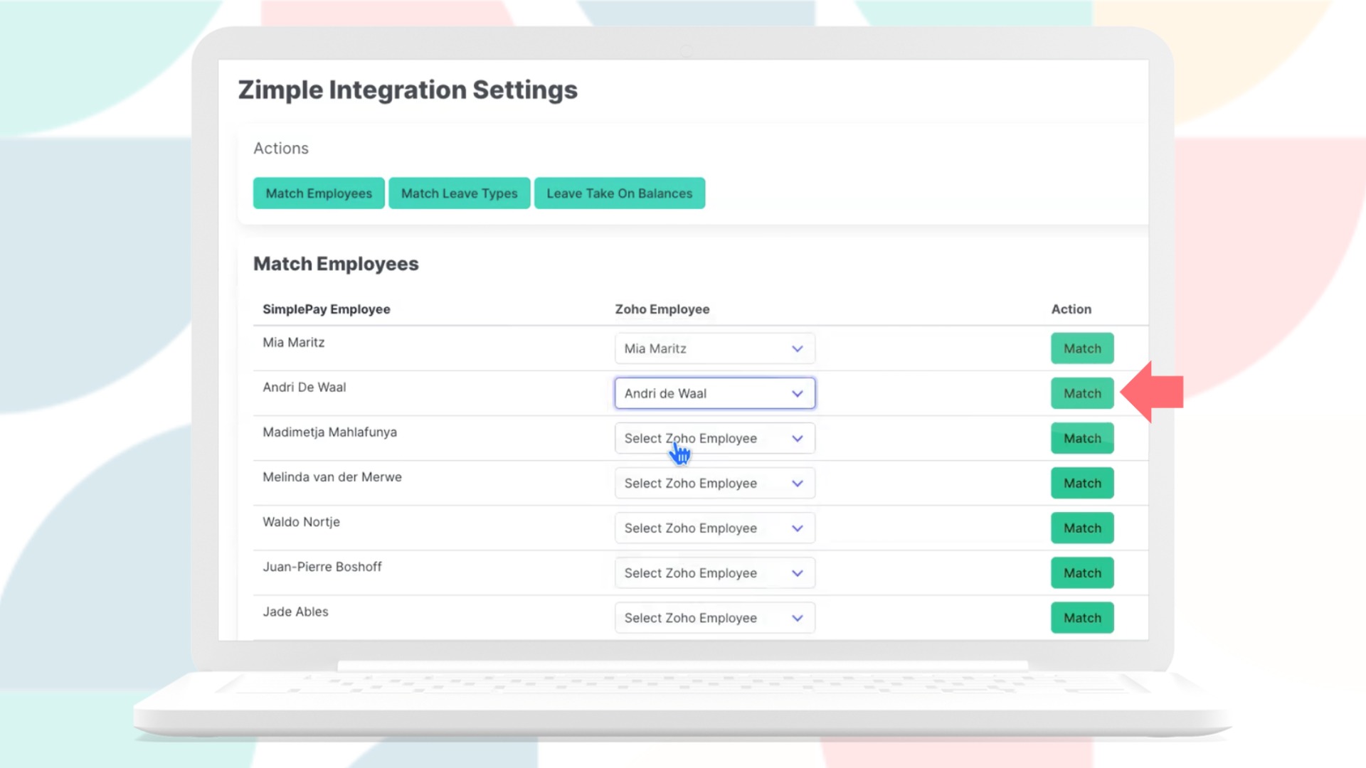 Start with Employees. Match each Simple Pay employee with the corresponding Zoho People employee. Click on "Match" to lock it in. Once all employees have been matched, you can "Submit" the matches at the bottom of the wizard screen.